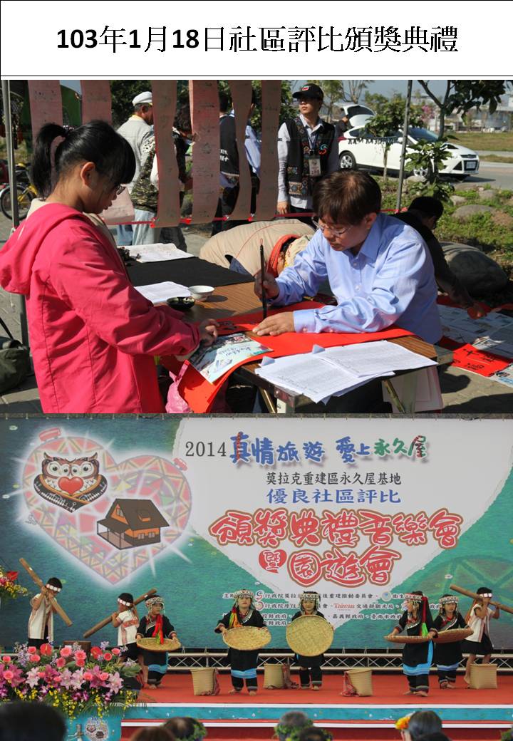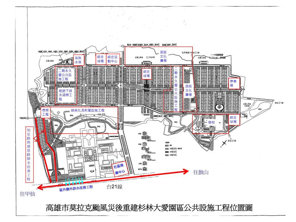 | 計畫安置 | 1.那瑪夏區南沙魯(民族)、瑪瑪(民生)、達卡奴瓦(民權)三里 2.甲仙區東安、西安、和安、關山、小林等里 3.桃源區勤和、寶山、梅山、拉芙蘭等里 4.茂林區多納里 5.六龜區寶來、新發(含新開部落)、中興、興龍 合計規劃1540戶 | 實際安置 | 第一期安置:754戶 第二期安置:250戶 |