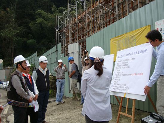 陳執行長為顧及偏遠山區達邦國小校園重建進度,由莊校長、陳家長會長、TVBS援建團隊等人員陪同訪視,除了解施工進度外,陳執行長對於校園設計已融入鄒族文化元素表示肯定,也請援建TVBS單位加強督導施工進度,讓學生在本(101)年8月31日開學時能在新的校區上課。