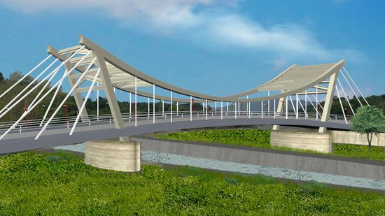 新建火山橋全長為280公尺,橋梁設計採用脊背橋型式,外觀造型優美,規模宏偉,其主要構造為鋼纜、塔、錨墩、吊索及橋面,構造簡單、維修容易,並融入民族宗教信仰「媽祖」文化意象,別具特色,吸引遊客駐足觀賞,配合暑假期間旅遊旺季宣導,將可帶動甲仙地區觀光產業發展及特色農產品行銷,恢復甲仙風災前繁榮盛景。工程目前預定進度65%,實際進度58%,已施工完成兩座橋台、橋墩及部分引道擋土牆,上部結構鋼梁已在工廠加工製造。在行政院重建會積極召開14次進度檢討會議,要求台灣媽祖聯誼會及承商排定工作進度,積極趕工下,管控在7月底前完工通車。