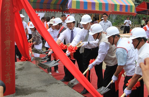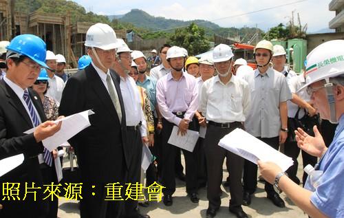 行政院長吳敦義關切重建進度,今(22)日率服務團隊前往南投縣水里鄉永久屋基地了解工程進度,援建的張榮發基金會表示,目前已完成44%,第一批住戶預計七月底前即可進住;院長隨後也前往由紅十字會援建的名間鄉永久屋基地,參加動土典禮。院長對兩單位無私的奉獻表示敬佩與感謝,並祝福工程順利,讓居民能盡快歡喜入住。