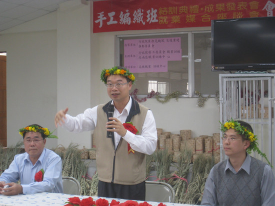 為協助受災地區居民學習原住民傳統專業技術,並協助原住民就業,由勞委會職訓局南區職訓中心委託高旗職業訓練中心,針對長治鄉百合部落的民眾開辦「手工編織創作班」的訓練課程,而為了讓學員在訓後順利就業,更在18日於屏東縣長治鄉老人文康中心舉辦結訓典禮暨成果發表及就業媒合活動,典禮中邀請行政院重建會產業重建處吳副處長瑞安、南區職業訓練中心李課長振宏、長治鄉公所林主任秘書潤錠、高旗職訓中心周執行長福星為現場26位結訓學員鼓勵。並邀集6家廠商參與,提供就業的職缺。