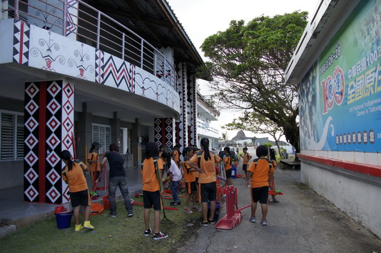 小朋友幫忙清潔災後校園環境