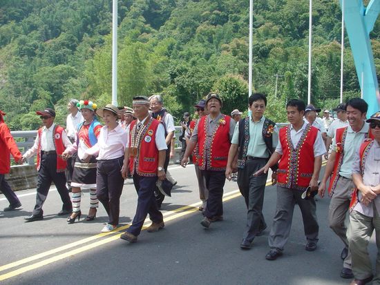 行政院重建會基礎建設處蔡志昌副處長、陸委會法政處楚恆惠專門委員、公路總局第五區養護工程處蔡宗成處長、嘉義縣張花冠縣長、汪志敏議員、阿里山鄉陳明利鄉長、代表會武青山主席、山美村莊信義村長、新美村汪堅雄村長及茶山村廖文調村長與地方貴賓及南三村部落居民歡喜參加通車典禮。