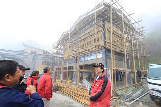 陳副執行長一行人在前往里佳部落,除視察聯外道路重建情況外,並特地訪視興建中的竹筍加工廠,嘉義縣阿里山鄉里佳村長楊重志在工廠向參訪來賓說明興建進度。楊重志說,竹筍工廠因山區下雨等氣候因素造成些許延遲,工程單位仍積極按照規劃期程進度執行,目前主建築已完成90%,僅剩內部裝潢部分,預期3月份可完工。他強調,工廠設計採用多種建材元素,如鋼構、竹子、金屬以及玻璃等素材,也特別保留部分空間提供族人工藝文化意象設計,融入鄒族文化特色,營造觀光遊憩環境,作為結合遊客參觀及部落產業中心之場域。實際了解筍場工程進度之後,重建會又前往茶廠預定地勘查,目前已順利取得用地,經現場瞭解茶廠將保留原貌,不作大面積開挖工程,僅小規模鋼構挑高方式施做,對水土保持影響不大。