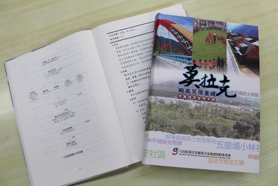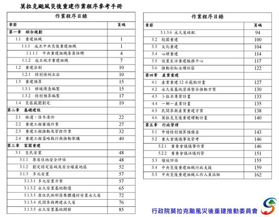 行政院重建會進一步表示,為了將莫拉克颱風災後重建的經驗有系統性地完整紀錄下來,讓政府各相關單位未來在面臨各項天然災害時,可參酌過去處理作法,以加速作業速度,並做更周全的規劃,出版「莫拉克颱風災後重建作業程序參考手冊」,供各界參考,然而氣候變遷,災害類型更加複雜,不同災害類型的重建工作未必相同,尚須依時空與不同條件作調整。